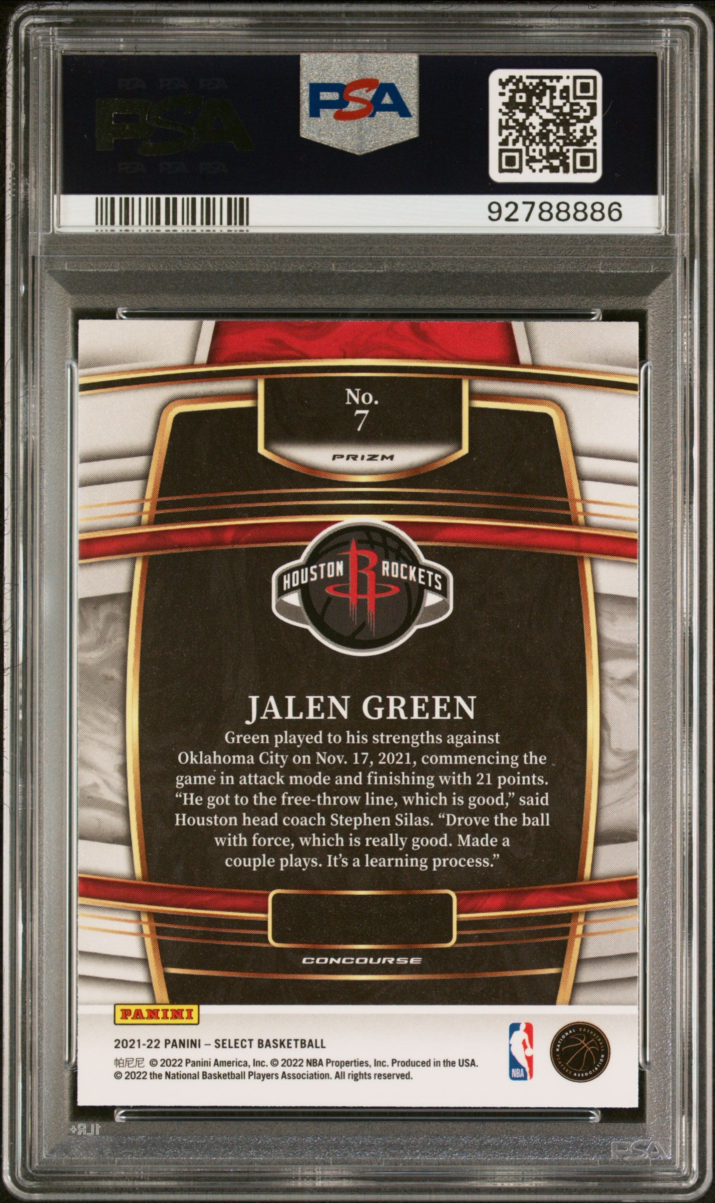 Thank you for choosing Rip N Rumble Cards! You are purchasing a 2021 Panini Select Jalen Green Blue Shimmer RC #7 PSA 10 in condition. Serious offers only! 😎 You will receive the exact item in the photos. All sales are final, we do not accept returns. Condition: Please expect all raw cards in near mint condition, not gem mint 10, unless otherwise noted. Most cards are pack fresh. All listings contain HD scans of front & back. Please understand that most thick, high end and/or patch cards (75pt+) DO NOT gem and come from the factory with flawed edges and/or corners. Factory Sealed Cards (High end, redemptions, etc.): We will not break the seal or remove any card from its case without commitment to purchase. Due to liability, we prefer not to remove any card from its original case for additional pictures, but will do so for serious buyers. Shipping: $5.00 Flat Rate USPS Ground Advantage. All cards are shipped within 3 business days of purchase, but most of the time same-day or next-day. No weekend shipping, M-F only. Cards purchased after 11:00am on Fridays may not be shipped until the following Monday. Cards purchased M-F before 11am CST have a higher likelyhood of being shipped same-day. Please be patient with Rip N Rumble Cards and USPS. Check for vacation mode! Combined Shipping: $0.50 per additional card w/ $10 cap, domestic (U.S) only. We do not have the ability to invoice or combine shipping on international orders. Please message us with any questions and follow us at ripnrumblecards. Listed With Mascot.
