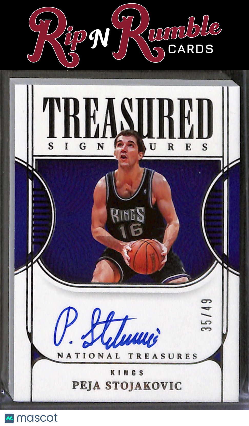 You are purchasing a 2022-23 National Treasures Peja Stojakovic Treasured Signatures /49 #TS-PJS from Rip N Rumble Cards LLC. You will receive the exact item in the photographs. Thank you for your business! All sales are final, we do not accept returns. Standard shipping rates are: $5.00 USPS Ground Advantage for ALL cards. If you purchase multiple items and prepay, any additional shipping costs will be refunded after the $5 is met. We cannot invoice International orders! Any International customer must purchase their cards in full WITH shipping costs, and the difference in shipping will be refunded. Any orders of 10+ raw cards or 5+ slabs may be shipped in multiple packages. We are not set up for huge orders! Handling time is 3 business days, but often much sooner. We do not ship on MOST weekends! Please note if our shop is in vacation mode! If this is the case, all orders will be shipped on or before the return date. Thank you for considering Rip N Rumble Cards, we do our best to have the greatest shipping and customer service possible to make every order easy and hassle free for our customers. We very much appreciate your business! Listed With Mascot.