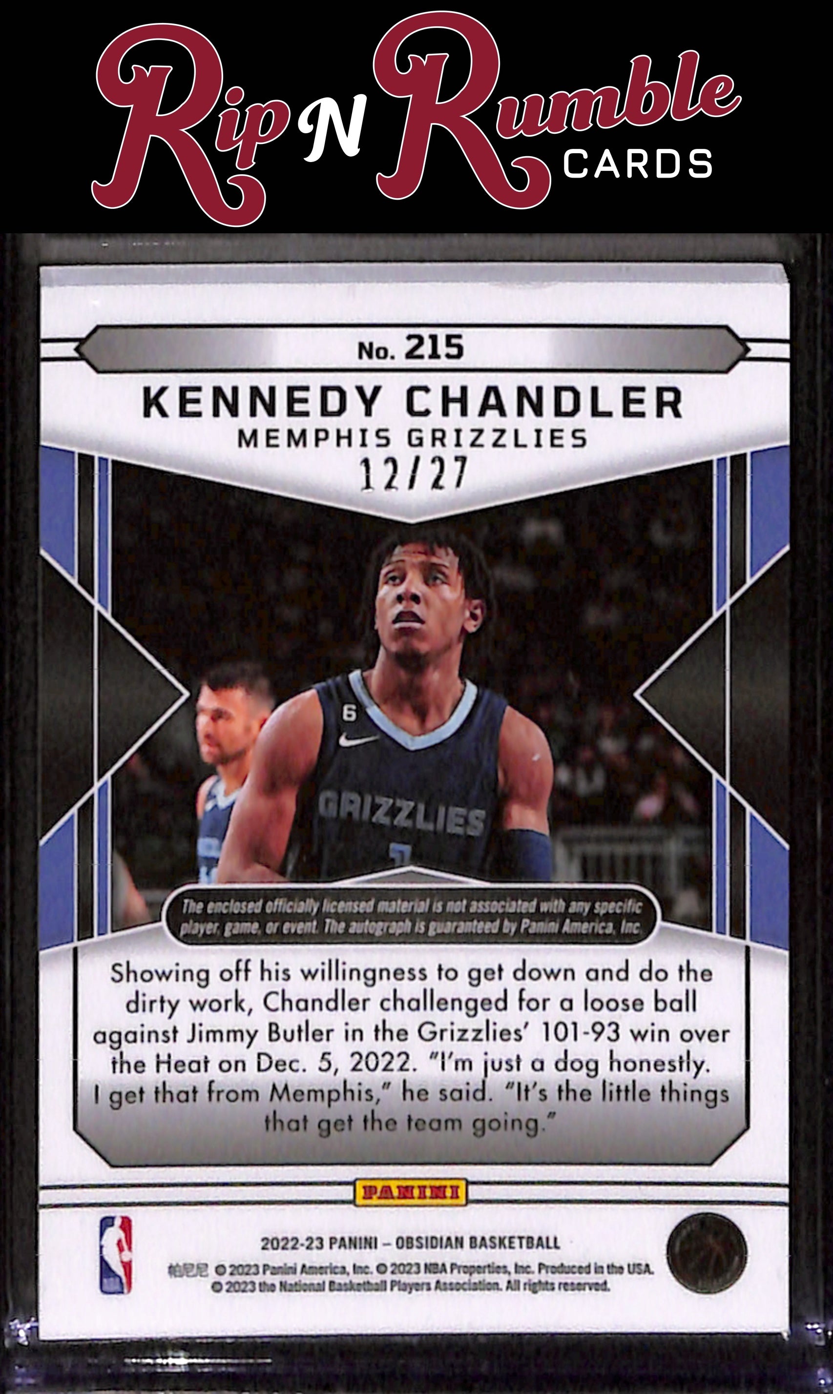 You are purchasing a 2022-23 Obsidian Kennedy Chandler Electric Etch Blue Flood FOTL /27 #215 from Rip N Rumble Cards LLC. You will receive the exact item in the photographs. Thank you for your business! All sales are final, we do not accept returns. Standard shipping rates are: $5.00 USPS Ground Advantage for ALL cards. If you purchase multiple items and prepay, any additional shipping costs will be refunded after the $5 is met. We cannot invoice International orders! Any International customer must purchase their cards in full WITH shipping costs, and the difference in shipping will be refunded. Any orders of 10+ raw cards or 5+ slabs may be shipped in multiple packages. We are not set up for huge orders! Handling time is 3 business days, but often much sooner. We do not ship on MOST weekends! Please note if our shop is in vacation mode! If this is the case, all orders will be shipped on or before the return date. Thank you for considering Rip N Rumble Cards, we do our best to have the greatest shipping and customer service possible to make every order easy and hassle free for our customers. We very much appreciate your business! Listed With Mascot.