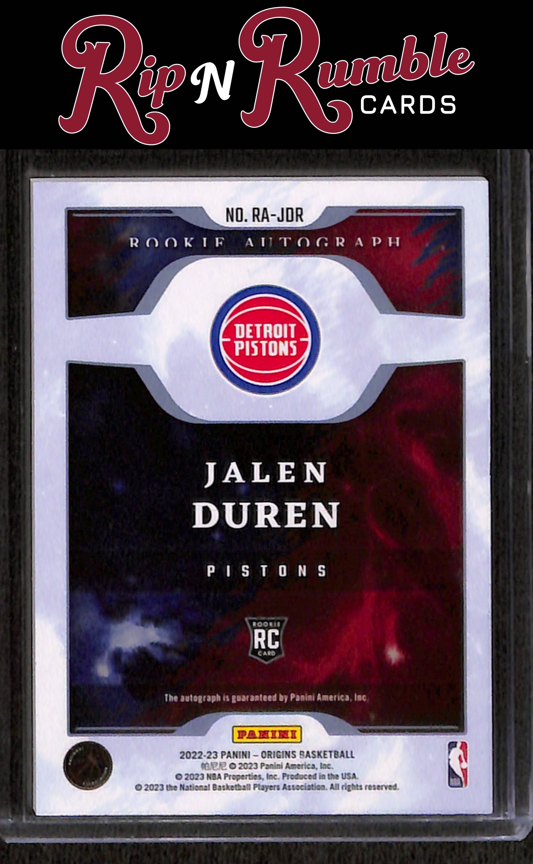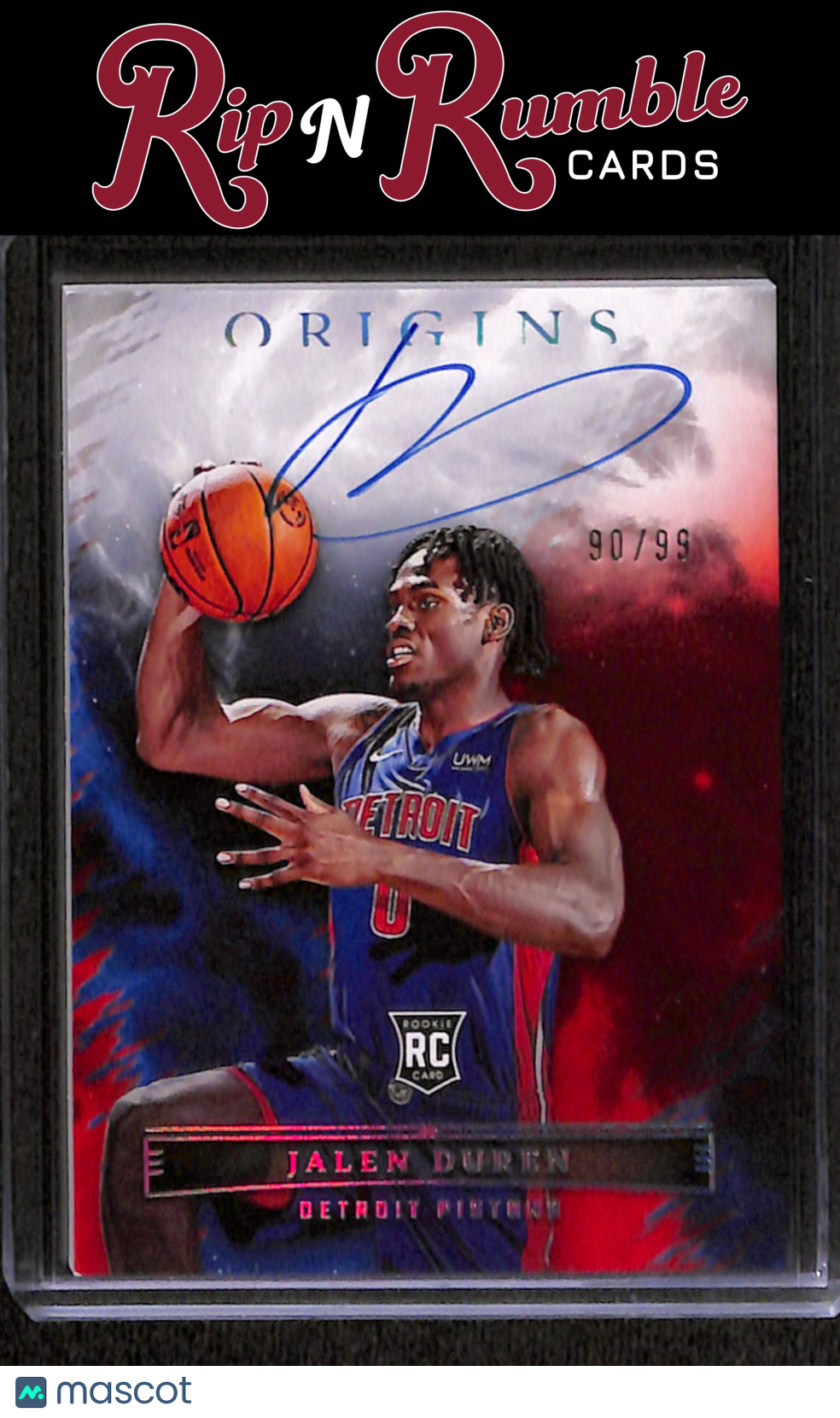 You are purchasing a 2022-23 Origins Jalen Duren Rookie Autographs Red /99 #RA-JDR from Rip N Rumble Cards LLC. You will receive the exact item in the photographs. Thank you for your business! All sales are final, we do not accept returns. Standard shipping rates are: $5.00 USPS Ground Advantage for ALL cards. If you purchase multiple items and prepay, any additional shipping costs will be refunded after the $5 is met. We cannot invoice International orders! Any International customer must purchase their cards in full WITH shipping costs, and the difference in shipping will be refunded. Any orders of 10+ raw cards or 5+ slabs may be shipped in multiple packages. We are not set up for huge orders! Handling time is 3 business days, but often much sooner. We do not ship on MOST weekends! Please note if our shop is in vacation mode! If this is the case, all orders will be shipped on or before the return date. Thank you for considering Rip N Rumble Cards, we do our best to have the greatest shipping and customer service possible to make every order easy and hassle free for our customers. We very much appreciate your business! Listed With Mascot.