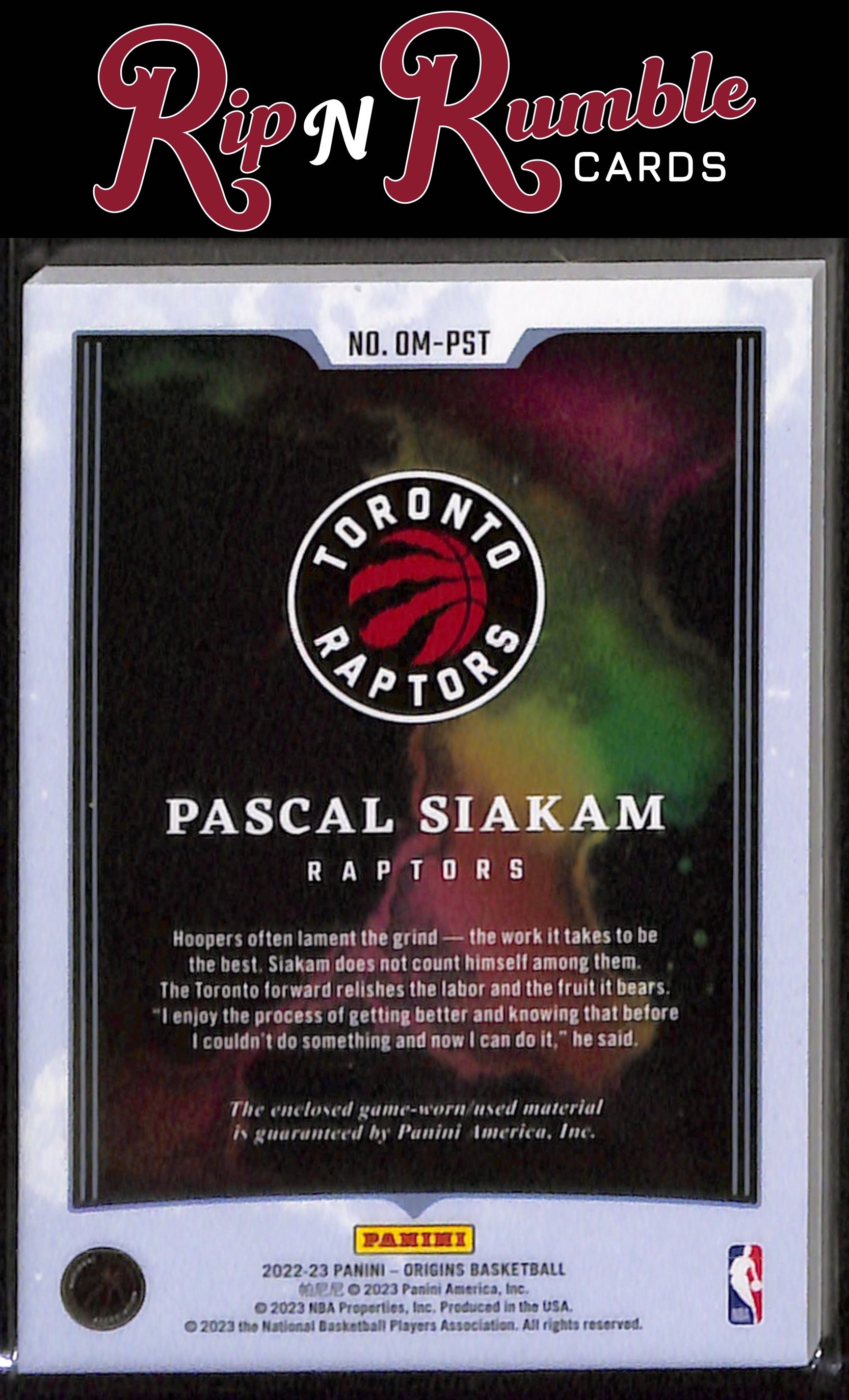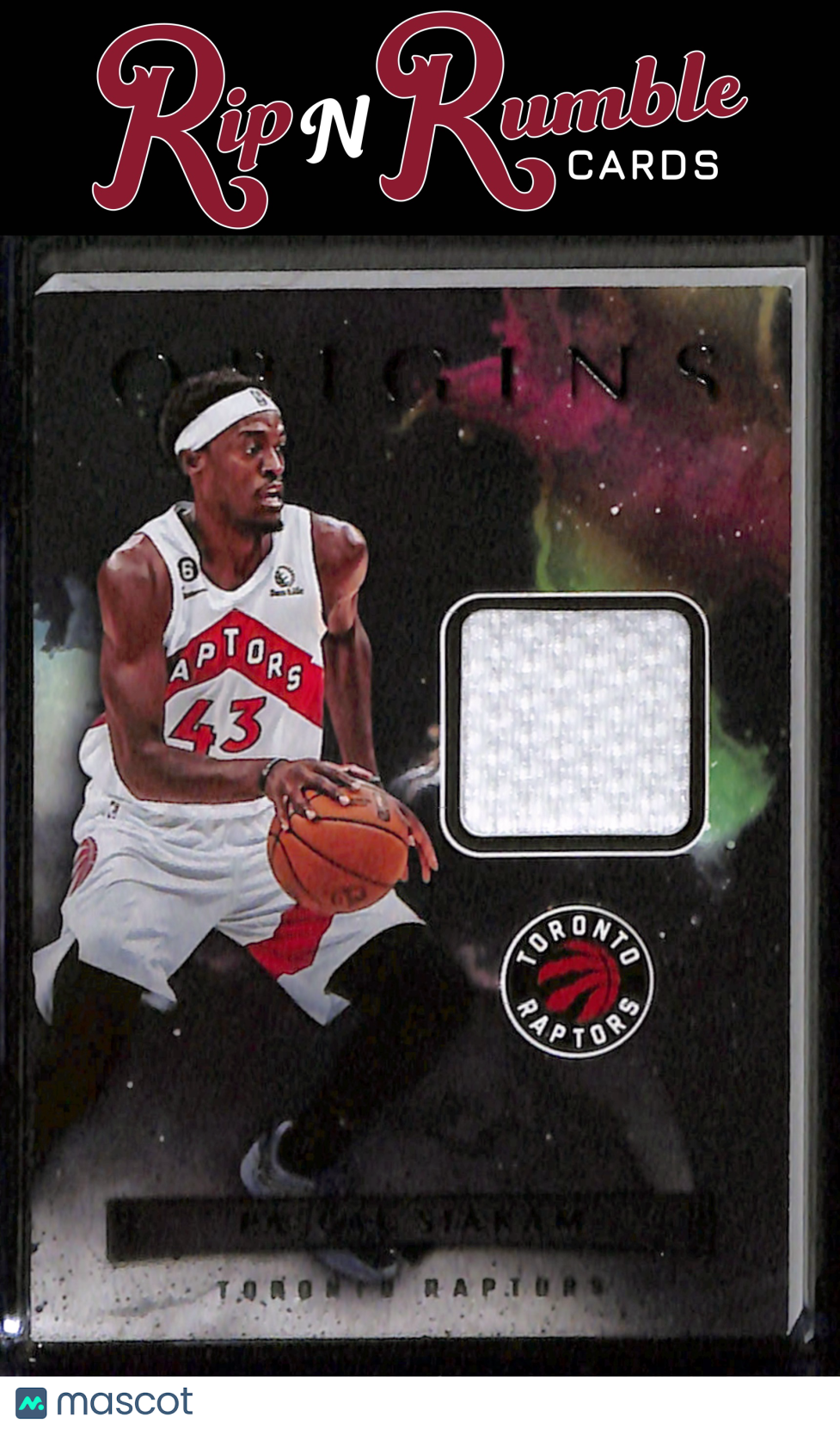 You are purchasing a 2022-23 Origins Pascal Siakam Origins Memorabilia #OM-PST from Rip N Rumble Cards LLC. You will receive the exact item in the photographs. Thank you for your business! All sales are final, we do not accept returns. Standard shipping rates are: $5.00 USPS Ground Advantage for ALL cards. If you purchase multiple items and prepay, any additional shipping costs will be refunded after the $5 is met. We cannot invoice International orders! Any International customer must purchase their cards in full WITH shipping costs, and the difference in shipping will be refunded. Any orders of 10+ raw cards or 5+ slabs may be shipped in multiple packages. We are not set up for huge orders! Handling time is 3 business days, but often much sooner. We do not ship on MOST weekends! Please note if our shop is in vacation mode! If this is the case, all orders will be shipped on or before the return date. Thank you for considering Rip N Rumble Cards, we do our best to have the greatest shipping and customer service possible to make every order easy and hassle free for our customers. We very much appreciate your business! Listed With Mascot.