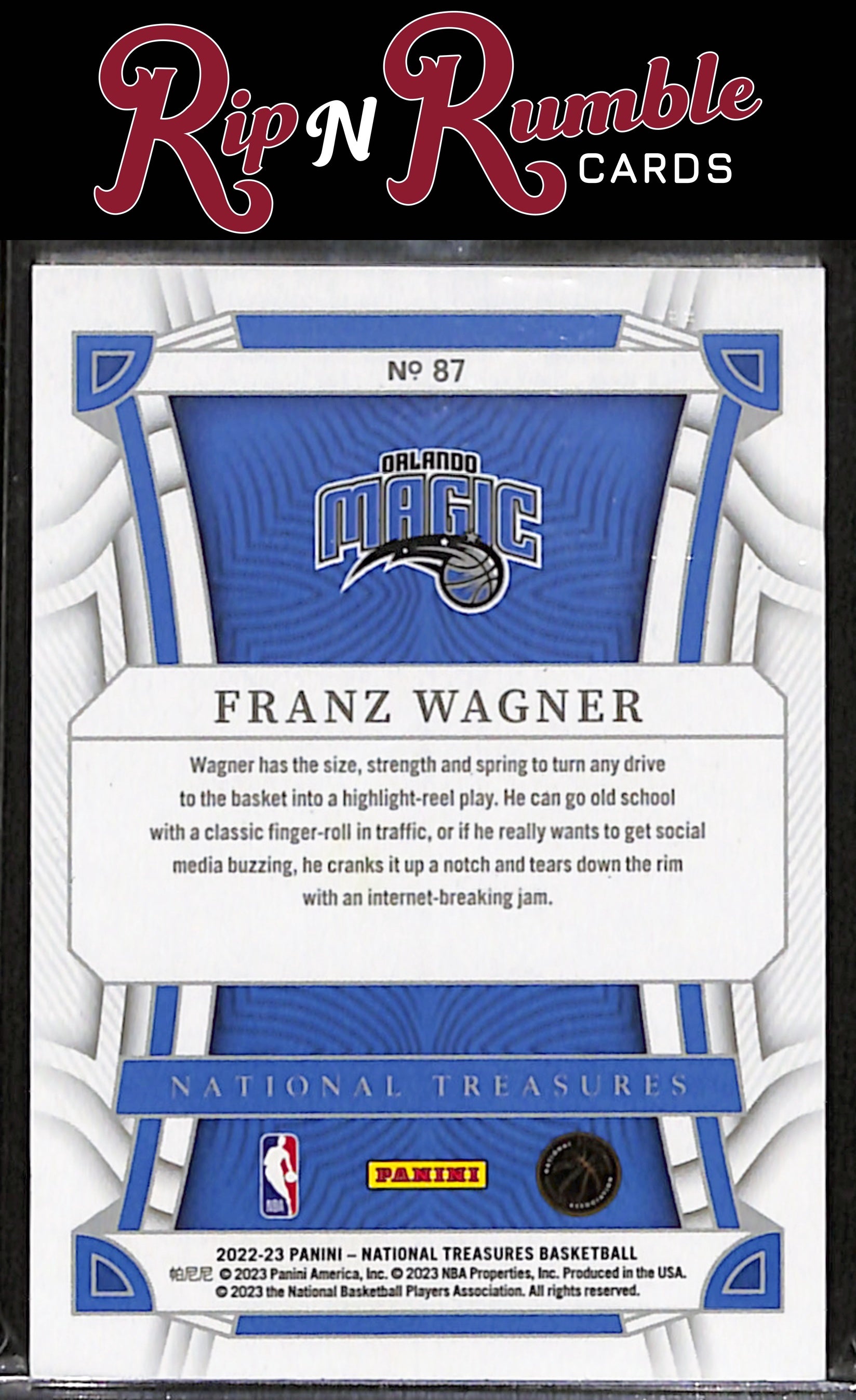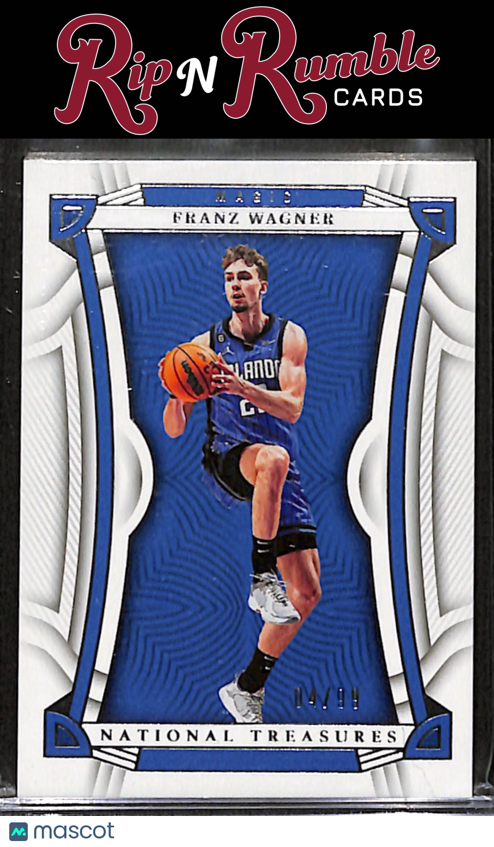 You are purchasing a 2022-23 Panini National Treasures Franz Wagner /99 #87 from Rip N Rumble Cards LLC. You will receive the exact item in the photographs. Thank you for your business! All sales are final, we do not accept returns. Standard shipping rates are: $5.00 USPS Ground Advantage for ALL cards. If you purchase multiple items and prepay, any additional shipping costs will be refunded after the $5 is met. We cannot invoice International orders! Any International customer must purchase their cards in full WITH shipping costs, and the difference in shipping will be refunded. Any orders of 10+ raw cards or 5+ slabs may be shipped in multiple packages. We are not set up for huge orders! Handling time is 3 business days, but often much sooner. We do not ship on MOST weekends! Please note if our shop is in vacation mode! If this is the case, all orders will be shipped on or before the return date. Thank you for considering Rip N Rumble Cards, we do our best to have the greatest shipping and customer service possible to make every order easy and hassle free for our customers. We very much appreciate your business! Listed With Mascot.
