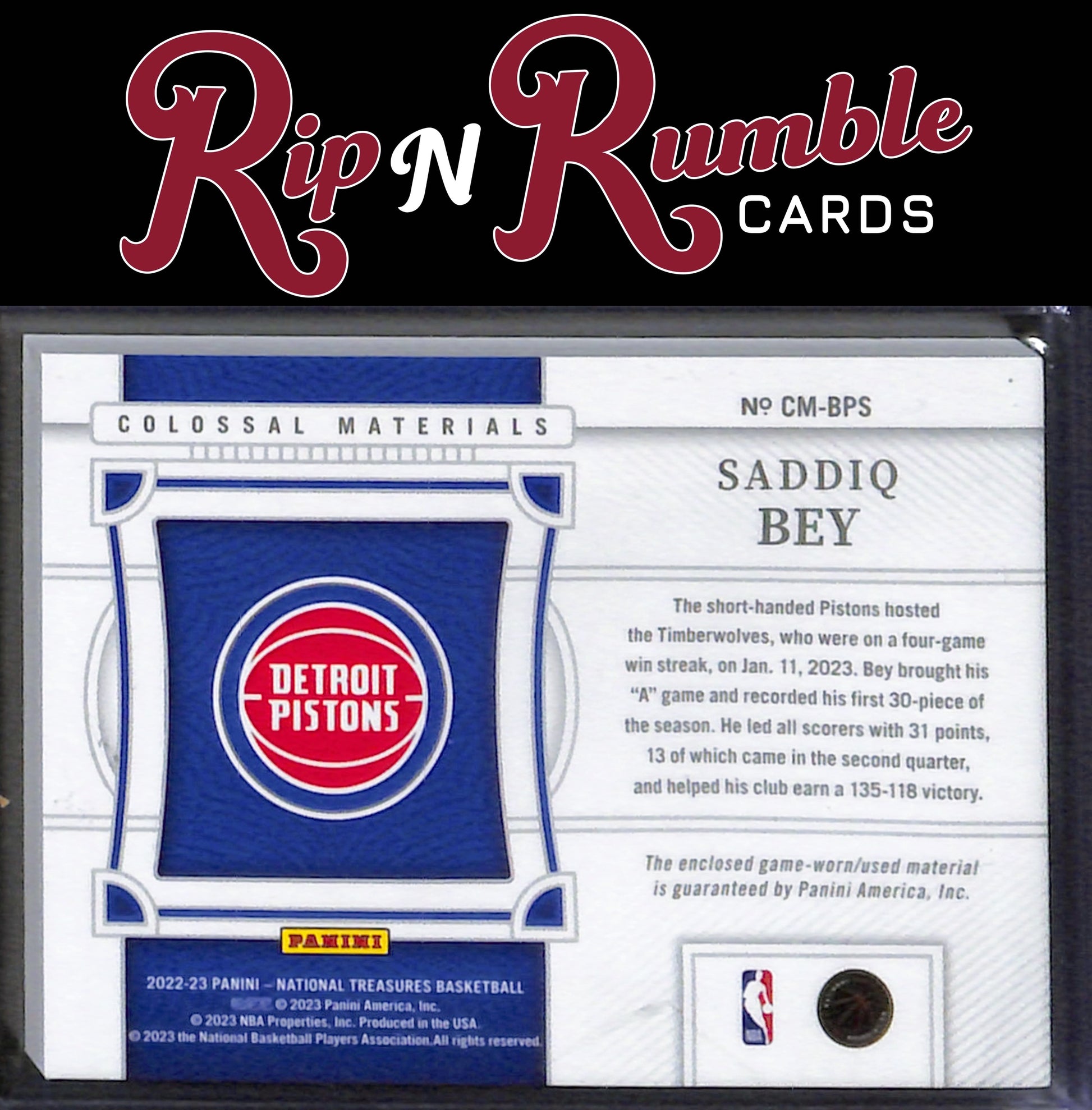 You are purchasing a 2022-23 Panini National Treasures Saddiq Bey Colossal Materials /99 #CM-BPS from Rip N Rumble Cards LLC. You will receive the exact item in the photographs. Thank you for your business! All sales are final, we do not accept returns. Standard shipping rates are: $5.00 USPS Ground Advantage for ALL cards. If you purchase multiple items and prepay, any additional shipping costs will be refunded after the $5 is met. We cannot invoice International orders! Any International customer must purchase their cards in full WITH shipping costs, and the difference in shipping will be refunded. Any orders of 10+ raw cards or 5+ slabs may be shipped in multiple packages. We are not set up for huge orders! Handling time is 3 business days, but often much sooner. We do not ship on MOST weekends! Please note if our shop is in vacation mode! If this is the case, all orders will be shipped on or before the return date. Thank you for considering Rip N Rumble Cards, we do our best to have the greatest shipping and customer service possible to make every order easy and hassle free for our customers. We very much appreciate your business! Listed With Mascot.