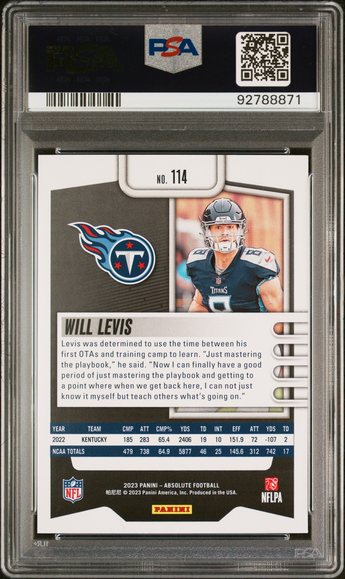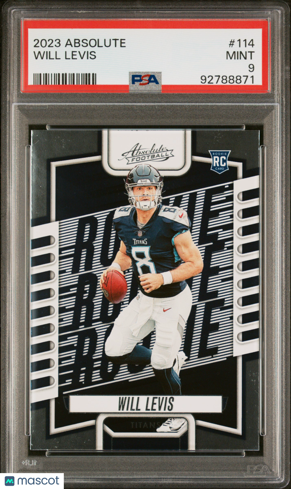 You are purchasing a 2023 Panini Absolute Will Levis #114 PSA 9 from Rip N Rumble Cards LLC. You will receive the exact item in the photographs. Thank you for your business! All sales are final, we do not accept returns. Standard shipping rates are: $5.00 USPS Ground Advantage for ALL cards. If you purchase multiple items and prepay, any additional shipping costs will be refunded after the $5 is met. We cannot invoice International orders! Any International customer must purchase their cards in full WITH shipping costs, and the difference in shipping will be refunded. Any orders of 10+ raw cards or 5+ slabs may be shipped in multiple packages. We are not set up for huge orders! Handling time is 3 business days, but often much sooner. We do not ship on MOST weekends! Please note if our shop is in vacation mode! If this is the case, all orders will be shipped on or before the return date. Thank you for considering Rip N Rumble Cards, we do our best to have the greatest shipping and customer service possible to make every order easy and hassle free for our customers. We very much appreciate your business! Listed With Mascot.