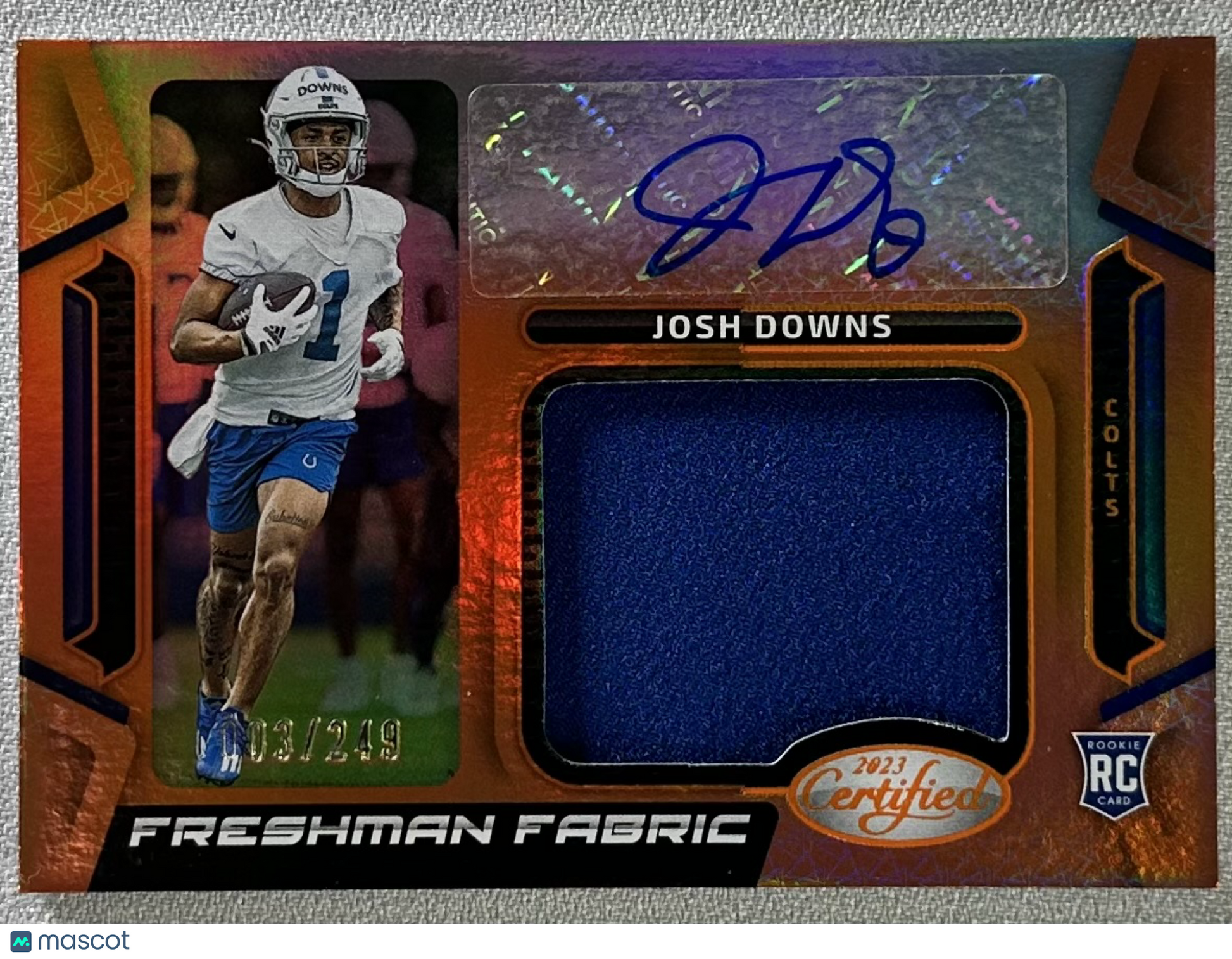 2023 Panini Certified Josh Downs Freshman Fabric Signatures Orange /249 RC