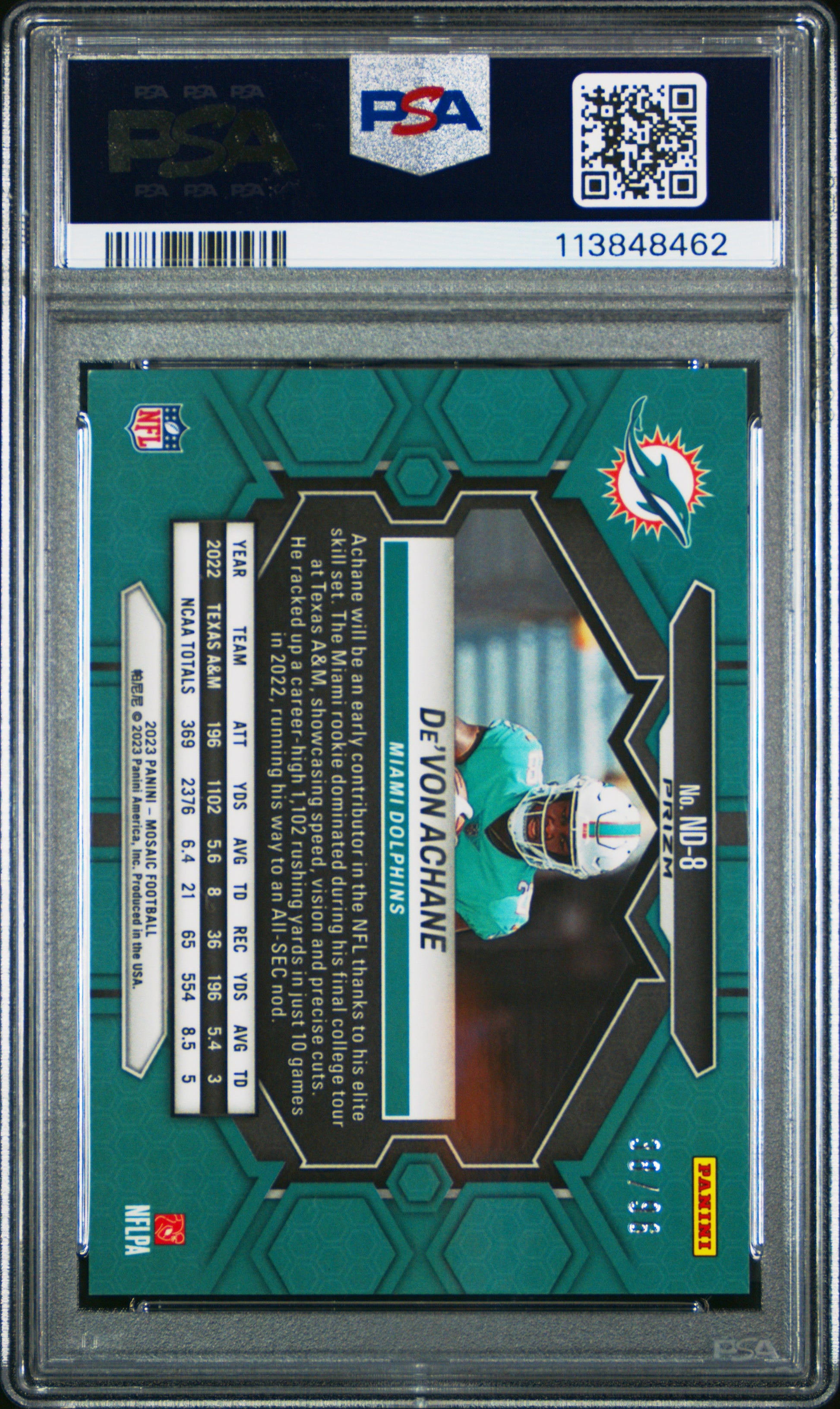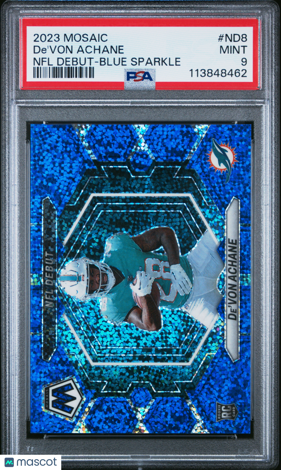 2023 Panini Mosaic De'von Achane NFL Debut Blue Sparkle 38/96 RC #ND8 PSA 9