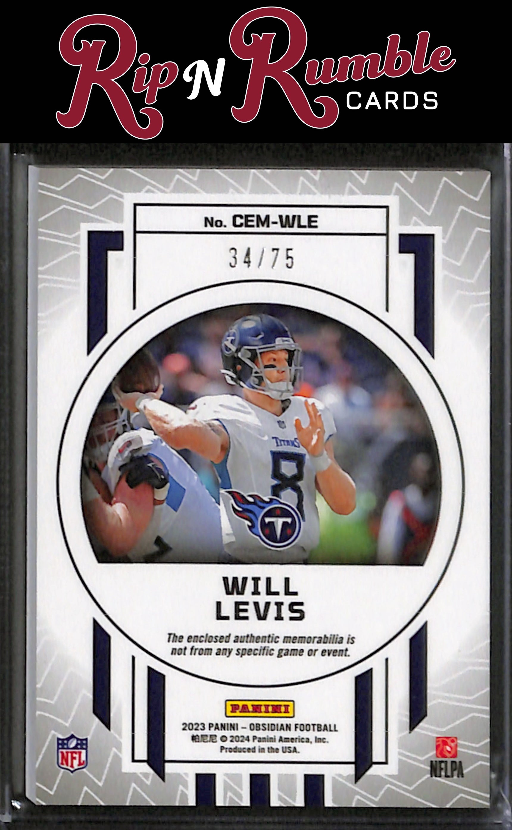 You are purchasing a 2023 Panini Obsidian Will Levis Cutting Edge Memorabilia Electric Etch Purple /75 #CEM-WLE from Rip N Rumble Cards LLC. You will receive the exact item in the photographs. Thank you for your business! All sales are final, we do not accept returns. Standard shipping rates are: $5.00 USPS Ground Advantage for ALL cards. If you purchase multiple items and prepay, any additional shipping costs will be refunded after the $5 is met. We cannot invoice International orders! Any International customer must purchase their cards in full WITH shipping costs, and the difference in shipping will be refunded. Any orders of 10+ raw cards or 5+ slabs may be shipped in multiple packages. We are not set up for huge orders! Handling time is 3 business days, but often much sooner. We do not ship on MOST weekends! Please note if our shop is in vacation mode! If this is the case, all orders will be shipped on or before the return date. Thank you for considering Rip N Rumble Cards, we do our best to have the greatest shipping and customer service possible to make every order easy and hassle free for our customers. We very much appreciate your business! Listed With Mascot.